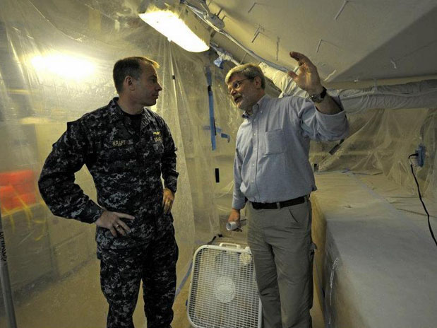 Kurt Yankaskas (right), programme director for the Office of Naval Research (ONR) Noise-Induced Hearing Loss programme, shows Rear Admiral Terry B. Kraft, Navy Warfare Development Command, Norfolk, Virginia, the progress of a spray-on acoustic treatment system aborad the USS Dwight D. Eisenhower on 2 Feb 2012. The ONR's programme is working on a range of measures that span training and education, noise mitigation and protection and medical technologies.