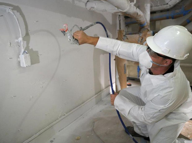 Technician Randal Olano applies the acoustic treatment as part of the ONR programme. The programme conducted preliminary noise measurements aboard the vessel in August 2011, using a 3D noise modelling/exposure tool. Applied to areas identified in the initial noise surveys, the spray-on thermal/damping control treatment could significantly reduce the noise-induced hearing loss of sailors serving aboard the Nimitz-class aircraft carrier.